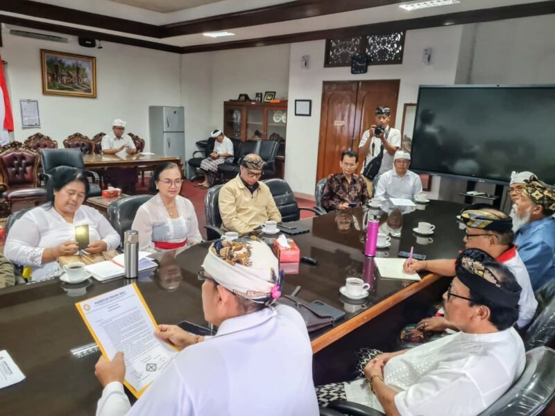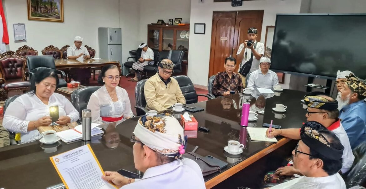 DENPASAR – Surya Dewata Keterangan foto :Ketum Paiketan Krama Bali, Dr. Ir. I Wayan Jondra, M.Si menyerahkan Pernyataan Sikap Paiketan Krama Bali kepada Sekretaris DPRD