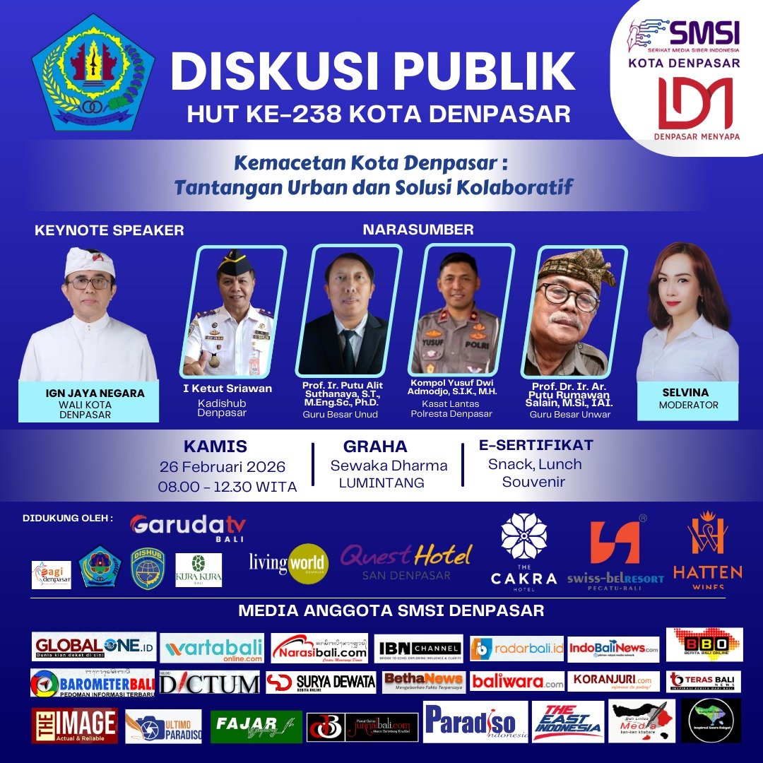 Sebagai bentuk kepedulian terhadap persoalan tersebut, Serikat Media Siber Indonesia (SMSI) Kota Denpasar menyelenggarakan diskusi publik bertajuk “Kemacetan Kota Denpasar: Tantangan Urban dan Solusi Kolaboratif”, yang akan digelar pada Kamis (26/2/2026) di Gedung Graha Sewaka Dharma, Lumintang, Denpasar.