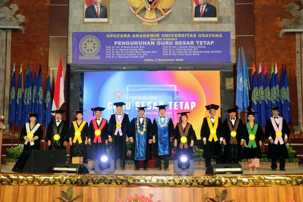 Universitas Udayana kembali mengukuhkan guru besar tetap. Kali ini sebanyak 9 guru besar dikukuhkan dalam upacara akademik yang dilaksanakan pada Sabtu (3/9) di Gedung Widya Sabha, Kampus Jimbaran.